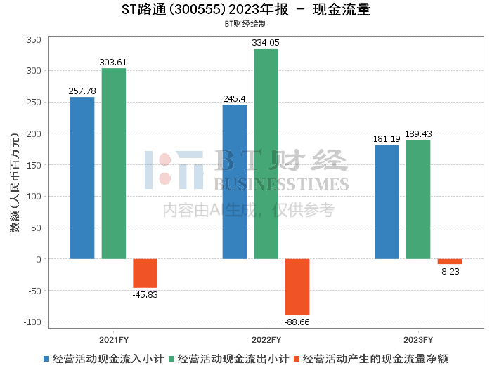 现金流量数据方面,ST路通2023年的经营活动产生的现金流量净额为-8.23百万元,虽然较上年的-88.66百万元有所改善,但仍然处于负值状态。这表明尽管公司在现金流管理上取得了一定进展,但经营活动产生的现金流仍然不足以支撑其正常运营。