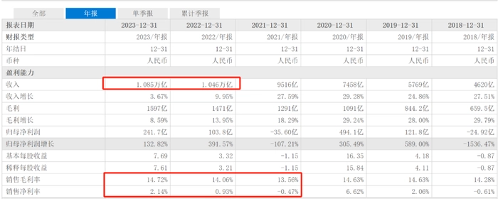 2023年,京东的毛利率和净利率均有所提升。14.72%的毛利率为2018年以来最高,2.14%的净利率也是2018年以来的第二高,仅次于2020年的6.62%。