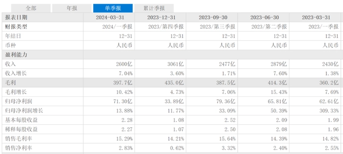 近期,京东发布了超出市场预期的2024年一季报,一季度京东营收2600亿元,同比增长7.04%,这一增速远高于去年同期的1.38%。归母净利润为71.3亿元,同比去年同期的61.61亿元增长13.88%。值得一提的是,一季度京东的毛利率和净利率均有提升,15.29%的毛利率相比去年同期的14.82%提升了0.47个百分点。2.83%的净利率也相比上一年同期的2.55%提升了0.28个百分点。