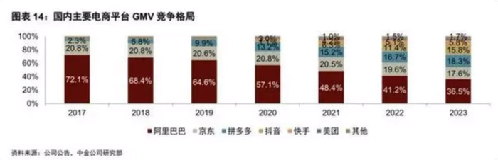 据中金公司研报中电商平台的GMV增速和格局变化,尽管2023年营收上京东位居第一,但GMV体量却不及阿里的8万亿元和拼多多的3.7万亿元,京东在2023年GMV约为3.6万亿元,而拼多多2021年的GMV仅为2.44万亿元,增长速度惊人。