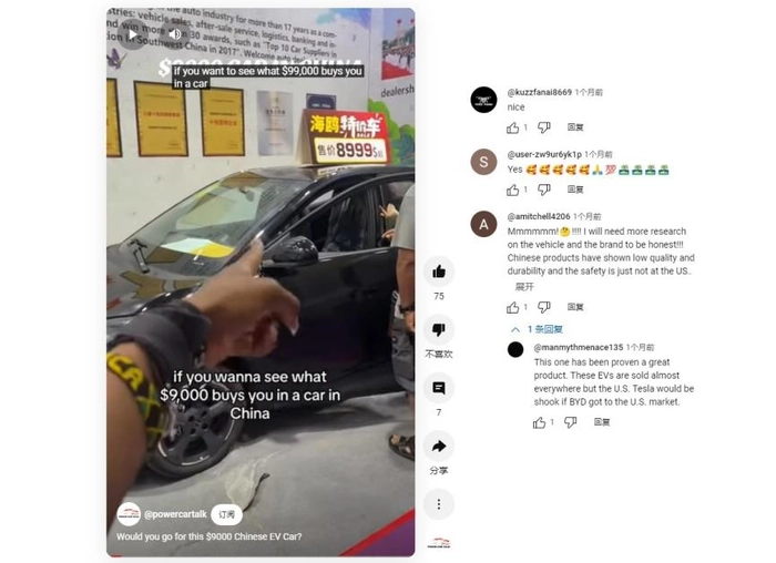 在评论区,虽然有人对售价如此便宜的车型质量做工提出担忧,但是很快有路人反驳:“在美国之外,这个品牌在全世界都卖遍了,已经被证明是好产品。如果放它进入美国市场,那特斯拉就会遭受冲击。”
