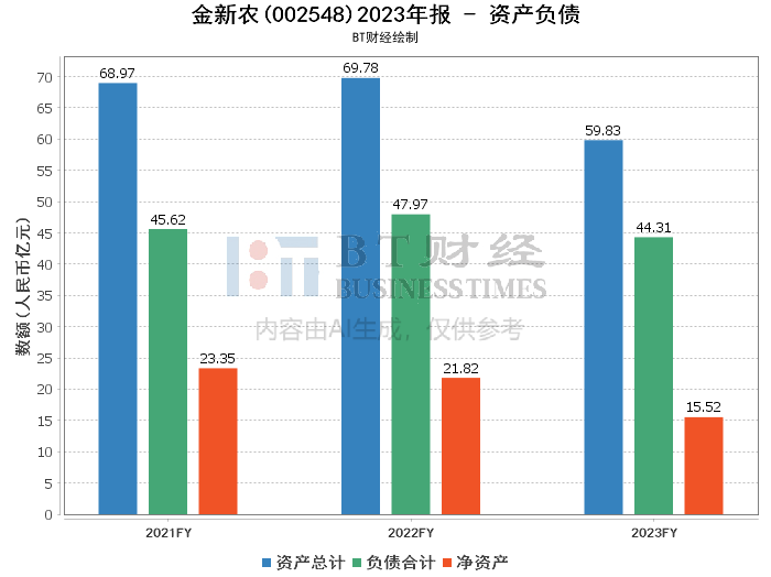 从资产负债数据来看,金新农的总资产由2022年的约697.85亿元减少到2023年的约598.34亿元,下降了14.26%。这一变化反映出公司在优化资产结构,减少非核心资产。负债合计从2022年的约479.69亿元减少到2023年的约443.12亿元,显示出公司在积极降低负债水平,提高财务稳健性。资产负债率从2022年的68.74%上升到2023年的74.06%,这一上升可能表明公司面临的财务压力有所增加,但也反映出公司在积极应对市场变化,优化财务结构的努力。