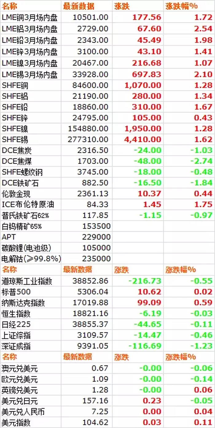 5月28日,LME六种基本金属价格全线上涨,铝领涨大盘。三月期铜价收于10501.5美元/吨,上涨1.72%。三月期铝价收于2729.5美元/吨,上涨2.54%。三月期铅价收于2343.5美元/吨,上涨1.98%。三月期锌价收于3100美元/吨,上涨1.41%。三月期锡价收于33928美元/吨,上涨2.10%。三月期镍价收于20467美元/吨,上涨1.07%。