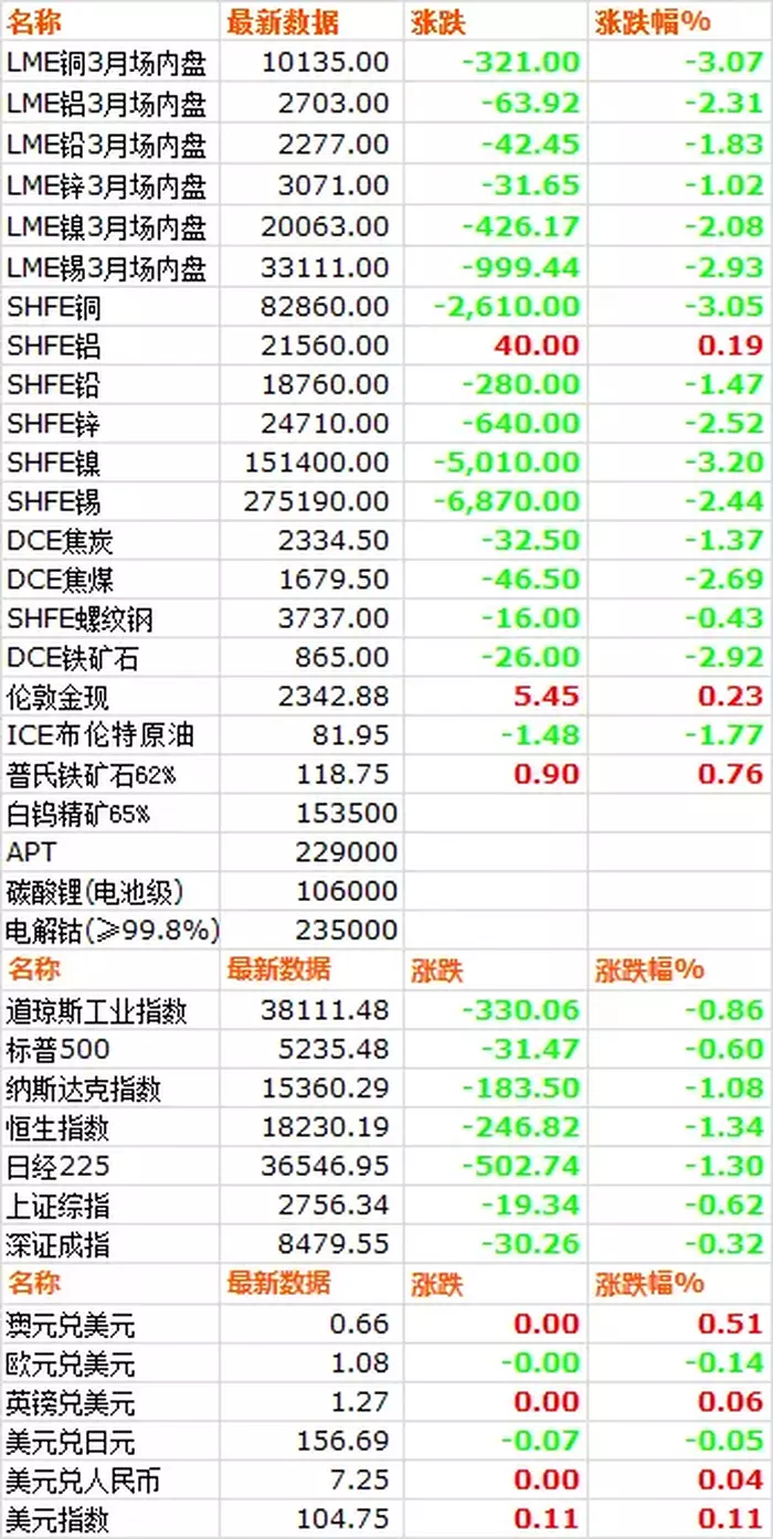 5月30日,LME六种基本金属价格全线下跌,铜领跌。三月期铜价收于10135美元/吨,下跌3.07%。三月期铝价收于2703.5美元/吨,下跌2.31%。三月期铅价收于2277美元/吨,下跌1.83%。三月期锌价收于3071.5美元/吨,下跌1.02%。三月期锡价收于33111美元/吨,下跌2.93%。三月期镍价收于20063美元/吨,下跌2.08%。