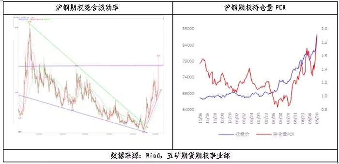隐含波动率上升,看涨情绪浓厚,市场预期6月铜价主要在75000-92000元/吨区间运行。伴随铜价加速上涨,沪铜期权隐含波动率自今年3月中下旬16%上涨至25%以上,5月20日铜价创历史新高,期权隐含波动率收于32.41%,位于近两年来高位,短期价格剧烈波动风险较高。从沪铜期权最大持仓量所在行权价来看,5月20日,cu2407合约看跌期权最大持仓量所在行权价为75000元/吨,期权费124元/吨,看涨期权最大持仓量所在行权价为92000元/吨,期权费1848元/吨,市场预期6月铜价主要在75000-92000元/吨运行。5月20日,看跌期权持仓量79911张,较上月同期增加16849张;看涨持仓量42080张,较上月同期减少4063张;持仓量PCR收于1.9,较上月同期大幅上升0.53,市场看涨情绪浓厚。