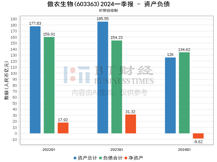 从资产负债数据来看,傲农生物在2024年一季度末的资产总计为126亿元,较期初的136.25亿元减少了7.53%。负债合计在期末为134.62亿元,较期初的141.28亿元也有所减少。然而,公司的资产负债率从期初的103.69%上升至期末的106.84%,显示出公司在负债方面的压力有所增加。商誉方面,期末余额为3.86亿元,较期初的3.86亿元略有减少,变化不大。