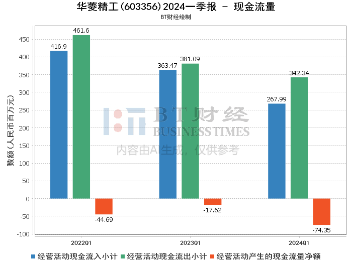 在现金流量数据方面,华菱精工的经营活动现金流入小计为2.68亿元,较上年同期的3.63亿元减少了26.24%。经营活动现金流出小计为3.42亿元,较上年同期的3.81亿元减少了10.16%。经营活动产生的现金流量净额为-74.35百万元,显示出公司在货款回笼方面存在较大压力,现金流状况不容乐观。