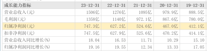再以年报来看,2023年,茅台总营收1506亿元,同比增长18.04%,是唯一一家营收规模超过千亿的白酒上市企业。净利润达747.3亿元,同比增长19.16%。同样还是以五粮液和洋河股份为例,五粮液2023年总营收为832.7亿元,同比增长12.58%;净利润302.1亿元,同比增长13.19%。曾经和茅台齐名的五粮液如今无论是在营收上还是净利润上均被茅台远远甩在身后。洋河股份2023年营收为331.3亿元,同比增长10.04%;净利润为100.2亿元,同比增长6.80%。作为国内白酒三强,茅台已经一枝独秀,远远超过第二的五粮液和第三的洋河股份。