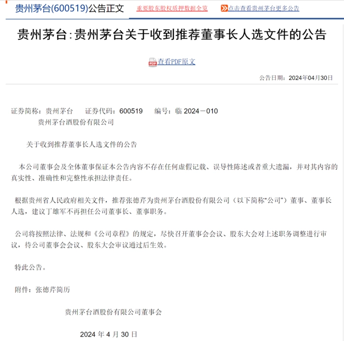 其实在股东大会之前,茅台已经官宣了换帅。4月30日,茅台公告,原习酒董事长张德芹接任茅台第九任董事长,原董事长丁雄军调任贵州省市场监督管理局(贵州省知识产权局)局长。