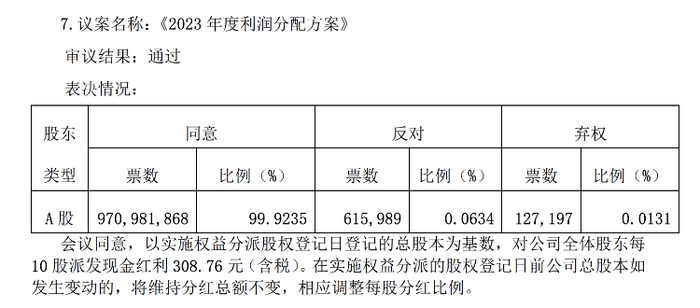 茅台2023年股东大会还通过了2023年度利润分配方案,分配方案显示,茅台对全体股东每10股派发现金红利308.76元,截至2023年12月31日,茅台总股本为125619.78万股,以此计算合计拟派发现金红利387.86亿元(税前)。叠加此前累计的2326.54亿元,茅台累计分红达2714.4亿元,超过2001年上市募资22亿元的123倍。