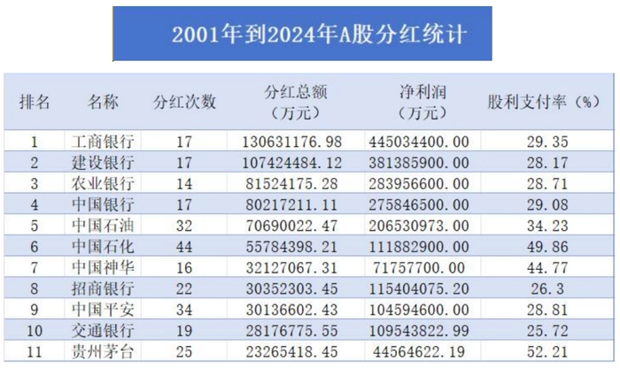 不仅是在白酒行业中分红突出,自2001年茅台上市至2024年,23年的分红金额在同期A股中居11位。而前十的企业中五大行和招商银行占据六席,中石油和中石化占据两席,中国平安和中国神华占据两席,前十均为中字头或中字背景,茅台的股利支付率为前十一位中最高。