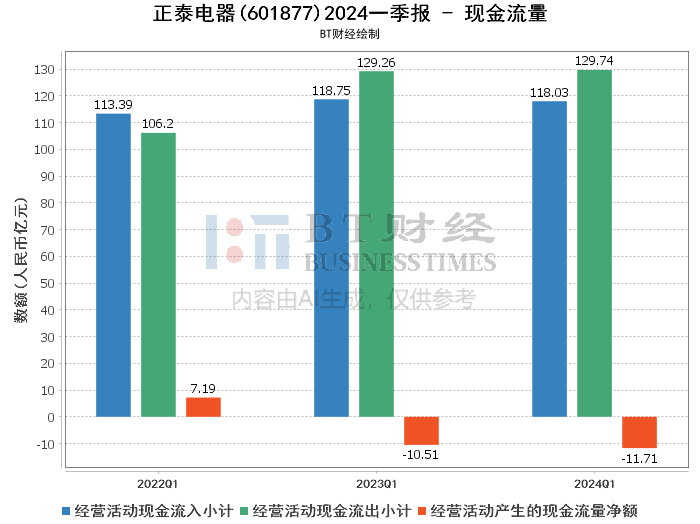 现金流量方面,正泰电器在2024年一季度的经营活动现金流入为118.03亿元,较上年同期的118.75亿元略有减少。经营活动现金流出为129.74亿元,较上年同期的129.26亿元略有增加,导致经营活动产生的现金流量净额为-11.71亿元。这表明公司在经营活动中现金流出较大,需关注其现金流管理和资金使用效率。