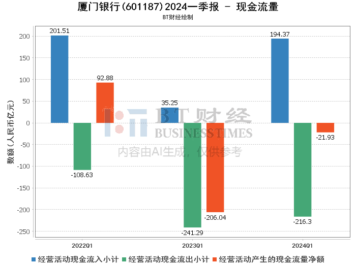 在现金流量方面,厦门银行2024年一季度经营活动产生的现金流量净额为-2,192,829千元,较上年同期的-20,603,722千元大幅改善。这主要是由于2024年一季度经营活动中同业及其他金融机构存放款项及卖出回购金融资产的增加,带来现金流入量的显著增加。尽管经营活动现金流为负,但其大幅改善显示出银行在现金流管理方面的有效性。