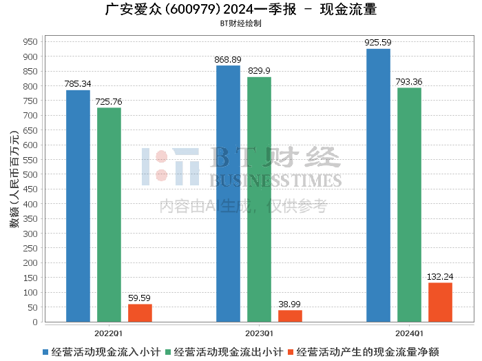在现金流量方面,广安爱众2024年一季度经营活动产生的现金流量净额为1.32亿元,较上年同期的38.99百万元增长了239.18%。经营活动现金流入小计为9.26亿元,较上年同期的8.69亿元有所增加,而经营活动现金流出小计为7.93亿元,较上年同期的8.3亿元有所减少。这表明公司在提高销售收入和控制支出方面取得了显著成效。