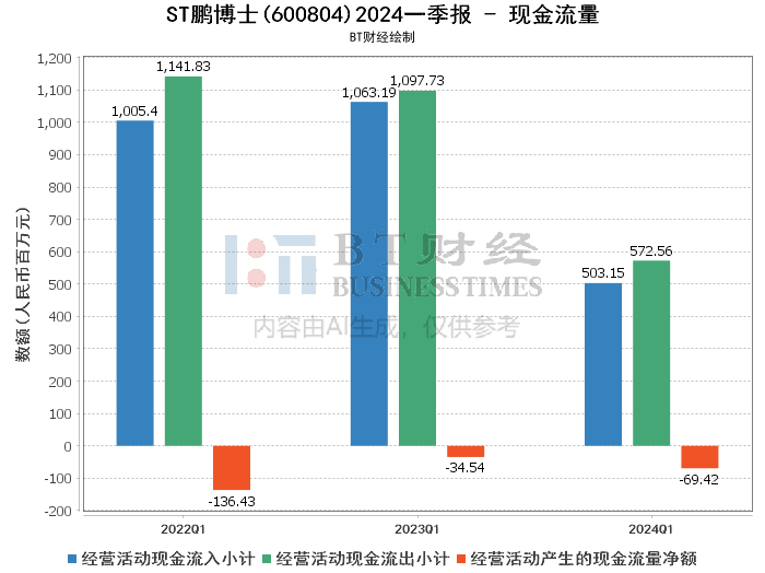 在现金流量方面,ST鹏博士在2024年一季度经营活动现金流入小计为5.03亿元,同比下降52.68%;经营活动现金流出小计为5.73亿元,同比下降47.84%。经营活动产生的现金流量净额为-6941.51万元,同比下降100.96%。现金流量的减少主要由于本报告期收入减少导致销售商品、提供劳务收到的现金同比减少。
