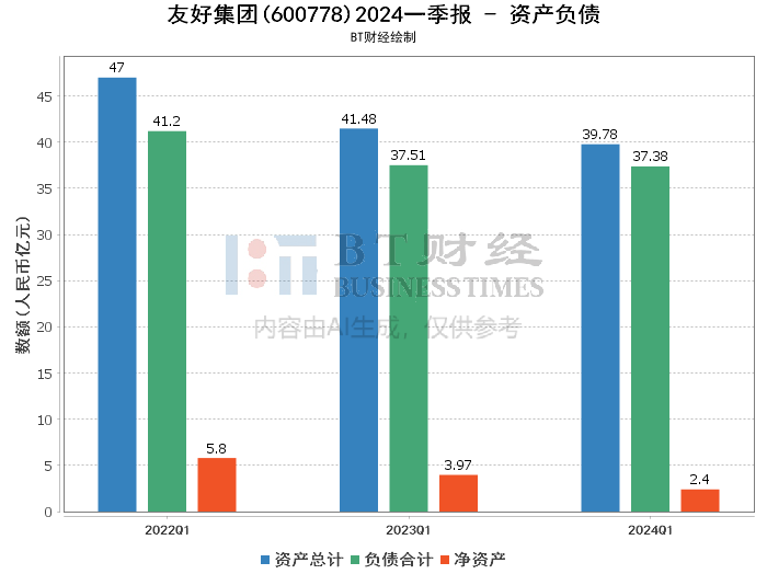从资产负债数据来看,友好集团在2024年第一季度末的资产总计为39.78亿元,较期初的40.1亿元略有下降,降幅为0.78%。负债合计从期初的37.85亿元减少至37.38亿元,降幅为1.24%。资产负债率从期初的94.4%下降至期末的93.97%,显示出公司在降负债方面取得了一定成效。