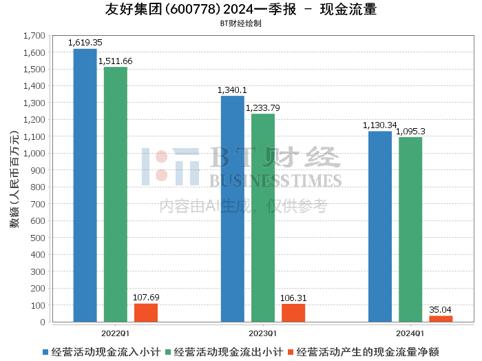 现金流量方面,友好集团在本报告期内经营活动产生的现金流量净额为35.04百万元,同比下降67.04%。经营活动现金流入小计为11.3亿元,同比减少15.65%;经营活动现金流出小计为10.95亿元,同比减少11.23%。现金流量的减少主要由于营业收入的下降,导致经营现金流入相应减少。
