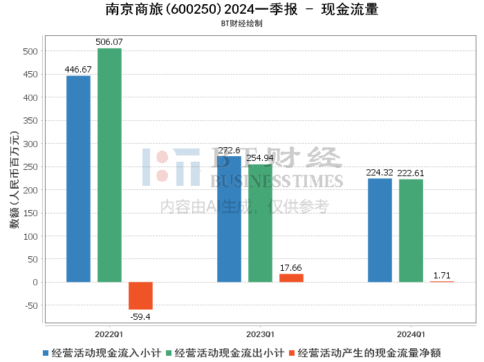 现金流量数据方面,南京商旅在2024年一季度的经营活动产生的现金流量净额为1.71百万元,较上年同期的17.66百万元大幅下降了90.32%。经营活动现金流入小计为2.24亿元,同比减少17.73%;经营活动现金流出小计为2.23亿元,同比减少12.68%。现金流量净额的大幅下降主要是由于本期收到与其他经营活动有关的保证金同比减少以及支付给职工和为职工支付的现金同比增加所致。