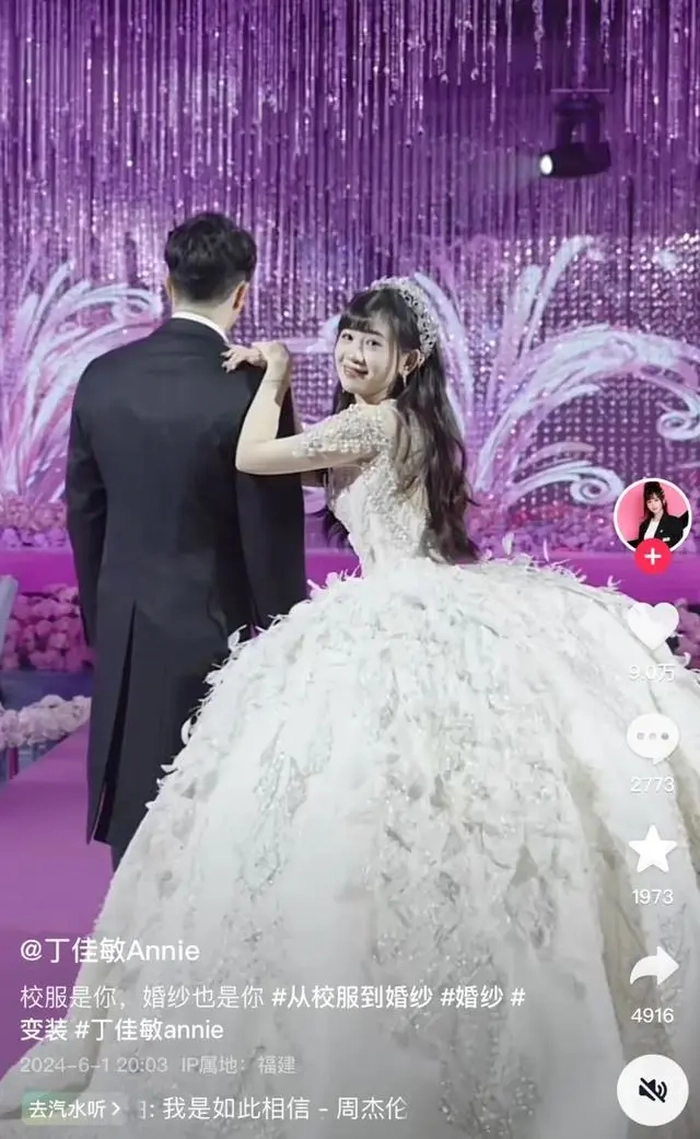 6月1日,特步小公主丁佳敏在抖音账号上发布了关于婚礼的照片和视频,配文是“校服是你,婚纱也是你”。婚礼现场嘉宾云集,赌王儿子何猷君也带着妻子奚梦瑶、妹妹何超欣参加这场豪门婚礼。