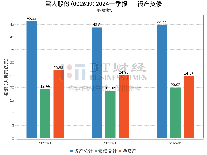 截至2024年一季度末,雪人股份的资产总计为44.66亿元,较期初的45.98亿元减少了2.86%。负债合计为20.02亿元,较期初的21.25亿元减少了5.77%。资产负债率从期初的46.22%下降至44.83%,显示出公司在降低负债方面取得了一定成效。商誉保持不变,期末余额为2.95亿元。从归属于上市公司股东的所有者权益来看,期末为24.38亿元,较期初的24.61亿元减少了0.96%。