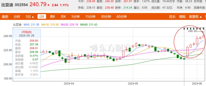受此多重利好消息,比亚迪的股价迎来一波连涨,截止6月5日收盘,比亚迪股价报收240.79元,进入2024年比亚迪首个交易日的开盘价为199.6元/股,这意味着比亚迪在年内股价涨幅达21%。东吴证券发布了研究报告《销量点评:5月销量表现亮眼,DM5.0落地强化产品力》,对比亚迪给出买入评级,目标价位为314.60元,以当前股价计算,预期上涨幅度为31%。