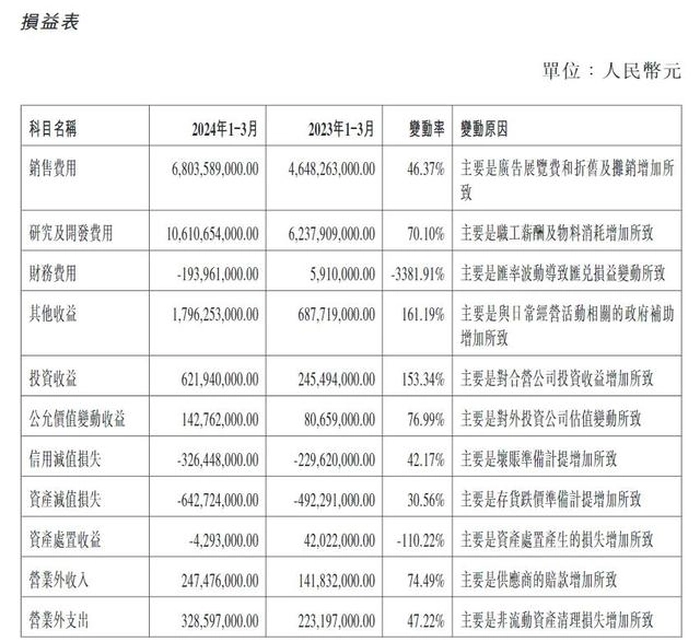 2024年一季度,比亚迪的销售毛利率再创新高,达21.88%,同比上年同期的17.86%再度提升了3.98个百分点。近三年同期,比亚迪的毛利率由2022年一季度的12.40%不断攀升,三年共计提升了9.48个百分点。