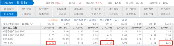 一季度3.82%的销售净利率看似不高,起码和2023年全年5.20%的销售净利率相比有所下滑,但纵观比亚迪的财报发现,比亚迪一季度的销售净利率相比全年偏低,不仅是比亚迪一家,BT财经查阅多家车企后发现,净利率偏低成为行业普遍现象。