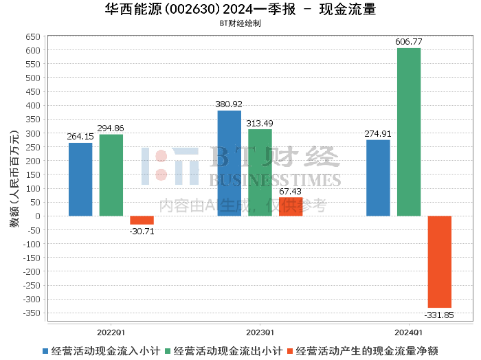 现金流量方面,华西能源2024年一季度经营活动产生的现金流量净额为-3.32亿元,而上年同期为67.43百万元,下降了592.13%。这一变化主要是由于报告期内经营活动现金流出增加至6.07亿元,而现金流入减少至2.75亿元。尽管公司在营业收入和利润方面表现出色,但经营活动现金流量净额的显著下降需要引起关注,可能反映出公司在项目执行过程中存在较大的资金压力。