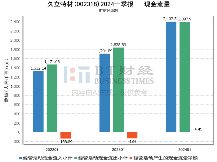 在现金流量方面,久立特材2024年一季度经营活动产生的现金流量净额为4.45百万元,而上年同期为-1.34亿元,显示出公司在经营活动现金流管理方面取得了显著改善。经营活动现金流入小计为24.02亿元,同比增长40.91%;经营活动现金流出小计为23.98亿元,同比增长30.43%。筹资活动产生的现金流量净额减少1018.22%,主要系银行借款本期到期归还增加所致。