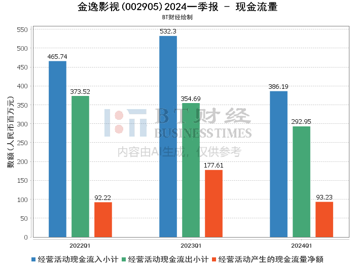 现金流量方面,金逸影视2024年一季度经营活动产生的现金流量净额为93.23百万元,同比下降47.51%。这一变化主要由于报告期内收入减少和经营活动现金流出增加所致。投资活动产生的现金流量净额为-1.11亿元,同比下降59.63%,主要原因是报告期内购买理财产品增加。筹资活动产生的现金流量净额为-8.19百万元,同比下降136.32%,主要由于报告期内银行借款减少。
