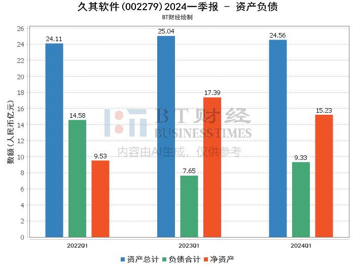 从资产负债数据来看,久其软件在2024年一季度末的总资产为24.56亿元,较上年度末的29.59亿元减少了17.00%。这一变化主要是由于货币资金减少了43.00%,至4.22亿元,主要原因是本期集中支付供应商采购款所致。此外,存货增加了30.90%,达到54.27百万元,反映出公司在手订单的成本投入增加。应付账款减少了48.85%,至2.88亿元,主要系本期支付供应商媒介结算款所致。总体来看,公司在一季度进行了较大规模的资金支付,导致货币资金和应付账款大幅减少。