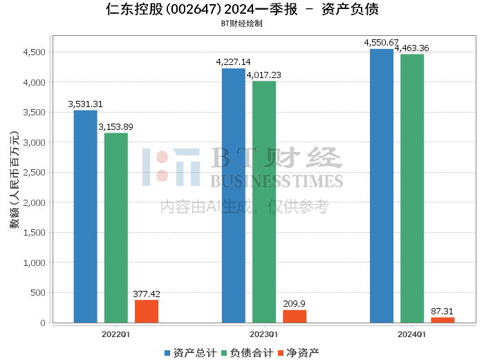 仁东控股在2024年一季度的资产总计为45.51亿元,较期初的44.28亿元增长了2.77%。负债合计为44.63亿元,较期初的43.13亿元增长了3.49%。商誉保持不变,期末余额为8.94亿元。资产负债率从期初的97.4%上升至期末的98.08%,显示出公司负债水平较高。应收账款增加了33.52%,主要是租赁业务应收账款增加所致;预付款项增加了71.88%,主要是第三方支付业务预付银行手续费增加所致。无形资产减少了66.09%,主要是无形资产摊销所致。