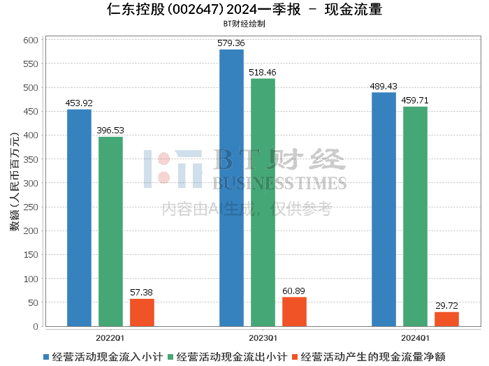 在现金流量方面,仁东控股2024年一季度经营活动产生的现金流量净额为29.72百万元,同比下降51.19%。经营活动现金流入小计为4.89亿元,同比减少15.53%;经营活动现金流出小计为4.6亿元,同比减少11.32%。投资活动产生的现金流量净额为-33.15百万元,同比减少28.13%,主要是本期购买固定资产的资金投入减少所致。筹资活动产生的现金流量净额为-9.98百万元,同比下降68.03%,主要是本期偿还债务及利息的支出增加所致。