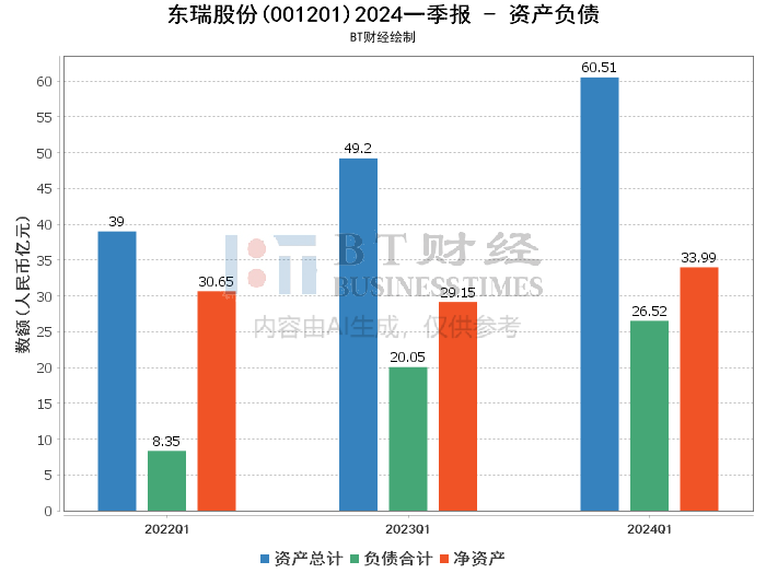 东瑞股份2024年一季报显示,资产总计期末余额为60.51亿元,较期初余额60.95亿元略有下降,降幅为0.71%。负债合计期末余额为26.52亿元,较期初余额25.88亿元有所增加,增幅为2.45%。资产负债率从期初的42.47%上升至期末的43.82%。尽管资产总计略有下降,但负债的增加导致资产负债率有所上升,表明公司在扩展业务的同时,负债压力也在增加。
