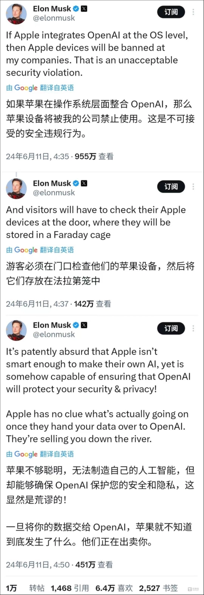 马斯克在苹果发布AI能力后表示,苹果不够聪明,无法开发自己的人工智能,但却能确保OpenAI保护你的安全和隐私,这显然是荒谬的。苹果完全不清楚把你的数据交给OpenAI后会发生什么,他们这么做完全是在出卖用户。
