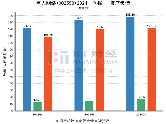 从资产负债数据来看,报告期末,巨人网络的资产总计达到138.16亿元,相比期初的133.71亿元,增长了3.33%。这一增长主要得益于公司业务规模的扩大和运营效率的提升。同时,公司的负债合计为17.06亿元,资产负债率保持在较低的12.35%,显示出公司稳健的财务结构和良好的偿债能力。