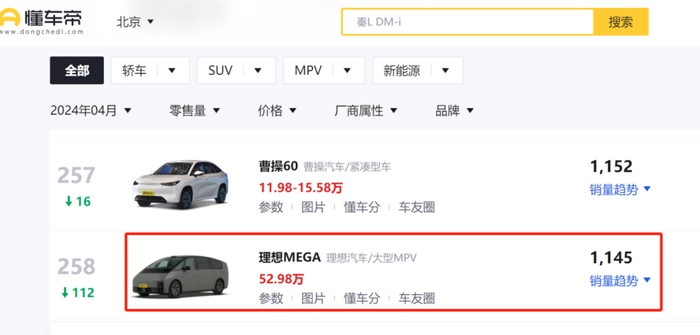MEGA或是理想自推出新车以来最为失败的一款车型,理想此前对 MEGA 的销量预期是能达到月销6000-8000辆,并在此基础上于今年下半年顺势推出纯电 SUV车型。据懂车帝公开数据显示MEGA 3月仅售出3229辆,4月则只有1145辆,位列258位,销量排名下滑了112位。