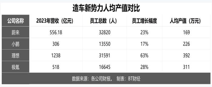 其实理想在5月初的裁员就是已经暗示了销量目标的可能下调,相应人员配置的缩减后,还要完成既定的销量目标并不现实。毕竟理想此前人均产出值已经在众多造车新势力中高居榜首。BT财经以造车新势力2023年总营收和实际员工总数,统计出的人均产出值,理想高达392万元。蔚来和小鹏人均产值则分别只有169万元和226万元,已经被理想超出一大截。值得一提的是新势力后起之秀的极氪人均产值相对较高,达311万元,和理想一样,人均产值都超过300万元。而理想是2023年员工增幅最高的一家,2023年员工增幅达63%,遥遥领先其他三家造车新势力。