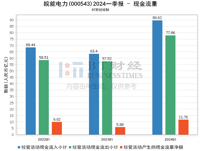 在现金流量方面,皖能电力的经营活动产生的现金流量净额为11.76亿元,同比增长68.31%。经营活动现金流入小计为89.62亿元,较上年同期的66.85亿元增长了34.06%。经营活动现金流出小计为77.86亿元,较上年同期的59.86亿元增长了30.05%。这些数据表明,公司在现金流管理方面表现良好,经营活动产生的现金流量显著增加。