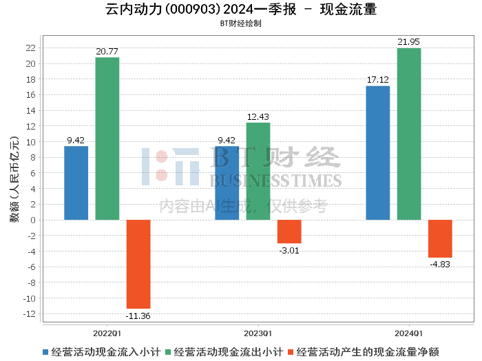 在现金流量方面,云内动力的经营活动现金流入为17.12亿元,同比大幅增长81.80%。然而,经营活动现金流出也大幅增加至21.95亿元,同比增长76.62%。最终,经营活动产生的现金流量净额为-4.83亿元,同比下降60.36%。这表明公司在经营活动中仍面临较大的资金压力,需要进一步优化现金流管理。