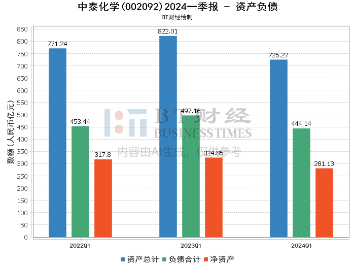 截至2024年3月31日,中泰化学的资产总计为725.27亿元,较期初的725.3亿元基本持平。负债合计为444.14亿元,较期初的431.26亿元有所增加,导致资产负债率从期初的59.46%上升至61.24%。这表明公司在负债方面有所增加,可能是由于短期借款的增加(从期初的47.58亿元增加到74.75亿元)以及应付票据的增加(从期初的16.37亿元增加到22.42亿元)。尽管如此,公司的商誉保持不变,显示出其在并购方面没有新的重大变化。
