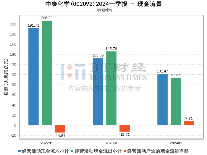 在现金流量方面,中泰化学的经营活动产生的现金流量净额为7.81亿元,较上年同期的-12.71亿元大幅改善,增幅为161.48%。这主要是由于本期经营活动现金流出减少所致(从上年同期的145.76亿元减少到本报告期的93.66亿元)。投资活动产生的现金流量净额为-2.57亿元,较上年同期的-10.48亿元有所改善,主要是由于购建固定资产、无形资产和其他长期资产支付的现金减少所致。筹资活动产生的现金流量净额为-7.4亿元,较上年同期的21.04亿元大幅下降,主要是由于本期归还资金增加所致。