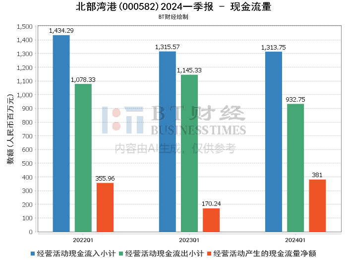 现金流量数据方面,北部湾港在2024年一季度的经营活动产生的现金流量净额为3.81亿元,较上年同期的1.7亿元增长了123.79%。尽管经营活动现金流入小计略有下降,但现金流出大幅减少,主要原因是支付代收代付款项减少。投资活动产生的现金流量净额为-1.04万元,较上年同期的-6.53万元显著改善,主要得益于处置子公司广西天宝能源有限公司带来的现金流入。筹资活动现金流量净额有所减少,主要由于偿还银行借款和支付合同租金增加。