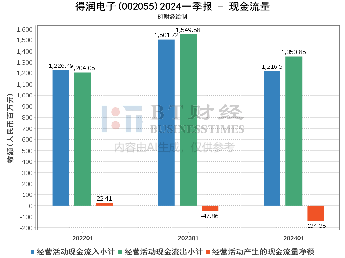 现金流量方面,得润电子2024年一季度经营活动产生的现金流量净额为-1.34亿元,同比下降180.74%。主要原因是公司在本期支付了前期供应商的货款。投资活动产生的现金流量净额为10.81百万元,同比增加38.08%,主要是由于赎回理财产品所致。筹资活动产生的现金流量净额为63.98百万元,同比增加127.11%,主要得益于公司借入大额长期借款以及受限资产解限。整体来看,公司在现金流管理方面面临一定压力,但通过筹资活动获得了较好的资金支持。