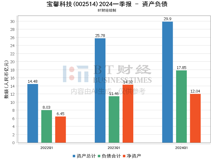 江苏宝馨科技股份有限公司(股票代码:002514)是一家专注于高端装备制造和新能源领域的企业。公司致力于为客户提供优质的产品和服务,涵盖了从研发、生产到销售的全产业链。2024年第一季度,宝馨科技发布了最新的财务报告,本文将对该报告中的关键数据进行详细分析。