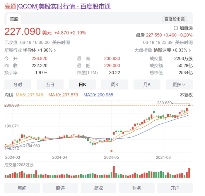 自2024年4月起,高通股价一扫之前的阴霾,开始了令人瞩目的上涨之旅。截至6月18日收盘,高通股价以227.09美元报收,较前一个交易日劲升4.87%,总市值飙升至2534亿美元,这一数字无疑让市场为之震惊。