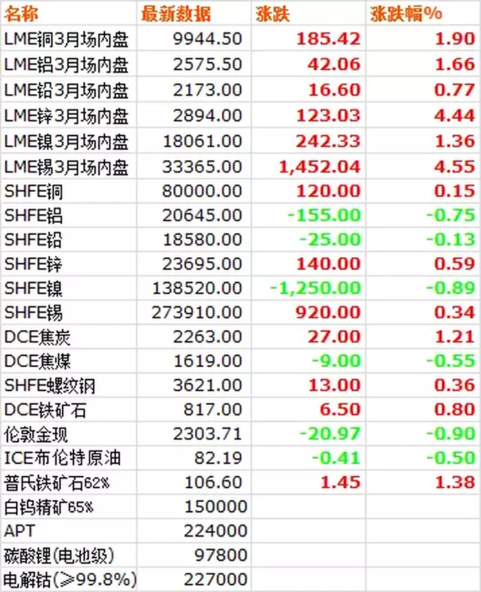 6月12日,LME六种基本金属价格全线上涨,锡领涨大盘,锌涨幅居前。三月期铜价收于9944.5美元/吨,上涨1.90%。三月期铝价收于2575.5美元/吨,上涨1.66%。三月期铅价收于2173美元/吨,上涨0.77%。三月期锌价收于2894美元/吨,上涨4.44%。三月期锡价收于33365美元/吨,上涨4.55%。三月期镍价收于18061美元/吨,上涨1.36%。