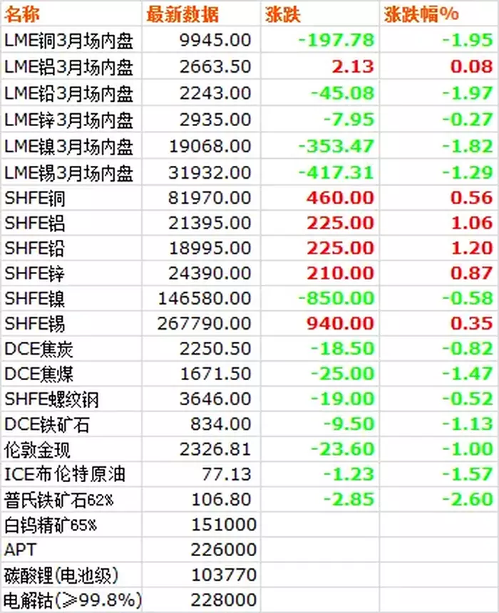 6月4日,LME六种基本金属价格跌多涨少,铅铜跌幅居前,仅铝轻微上涨。三月期铜价收于9945美元/吨,下跌1.95%。三月期铝价收于2663.5美元/吨,上涨0.08%。三月期铅价收于2243美元/吨,下跌1.97%。三月期锌价收于2935美元/吨,下跌0.27%。三月期锡价收于31932美元/吨,下跌1.29%。三月期镍价收于19068美元/吨,下跌1.82%。