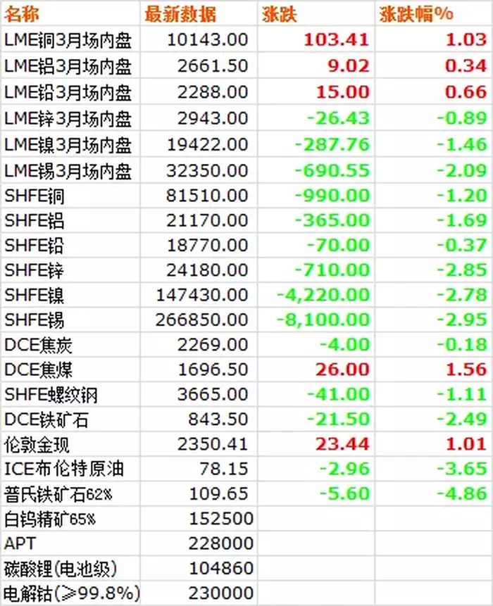 6月3日,LME六种基本金属价格涨跌互现,铜涨幅居前,锡跌幅居前。三月期铜价收于10143美元/吨,上涨1.03%。三月期铝价收于2661.5美元/吨,上涨0.34%。三月期铅价收于2288美元/吨,上涨0.66%。三月期锌价收于2943美元/吨,下跌0.89%。三月期锡价收于32350美元/吨,下跌2.09%。三月期镍价收于19422美元/吨,下跌1.46%。