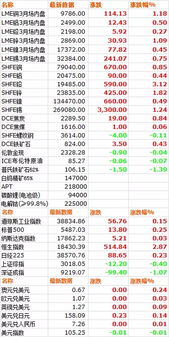 6月19日,LME六种基本金属价格全线上涨,铜领涨大盘。三月期铜价收于9786美元/吨,上涨1.18%。三月期铝价收于2499美元/吨,上涨0.50%。三月期铅价收于2198.5美元/吨,上涨0.27%。三月期锌价收于2869美元/吨,上涨1.09%。三月期锡价收于32384美元/吨,上涨0.75%。三月期镍价收于17372美元/吨,上涨0.45%。